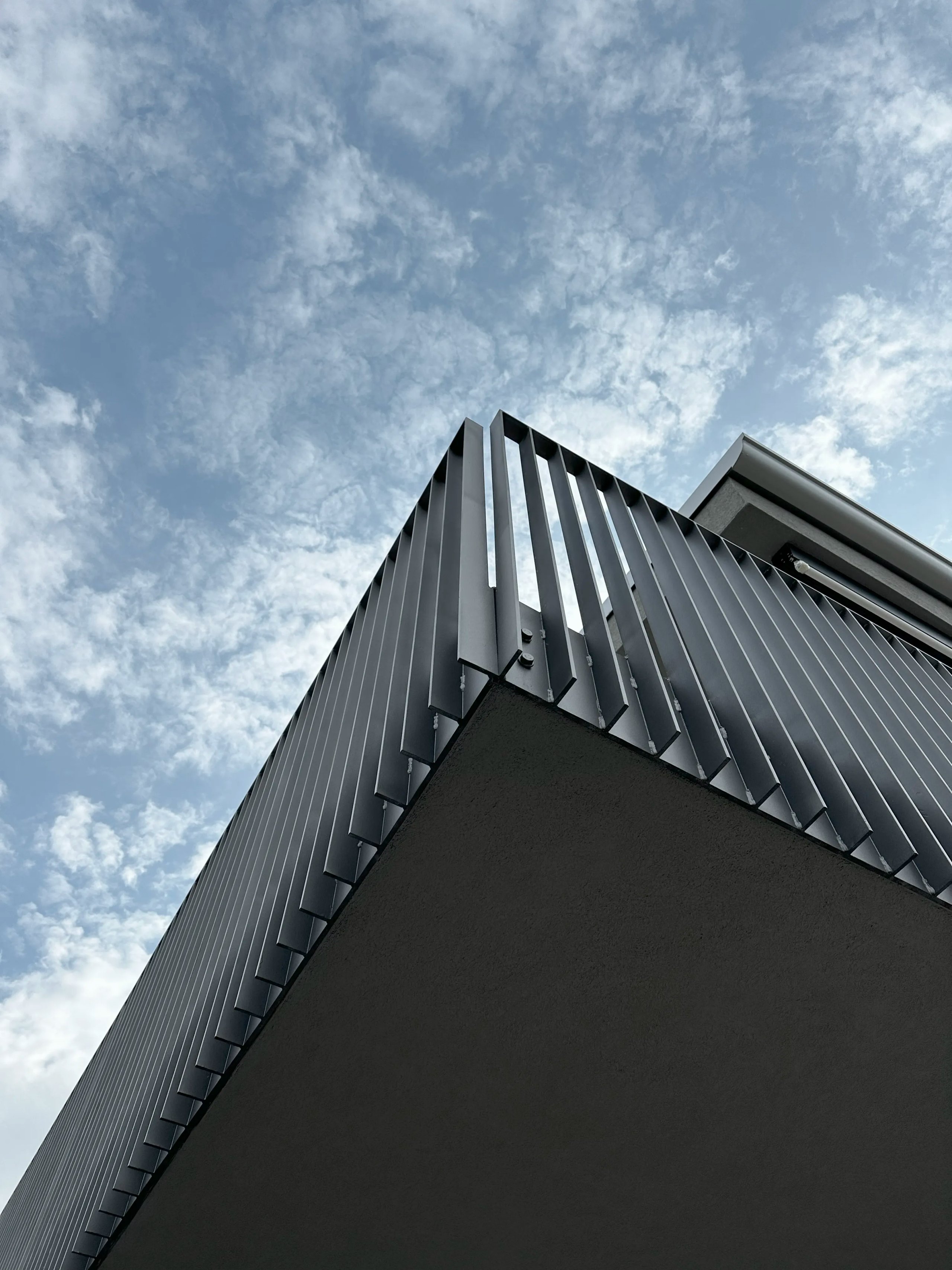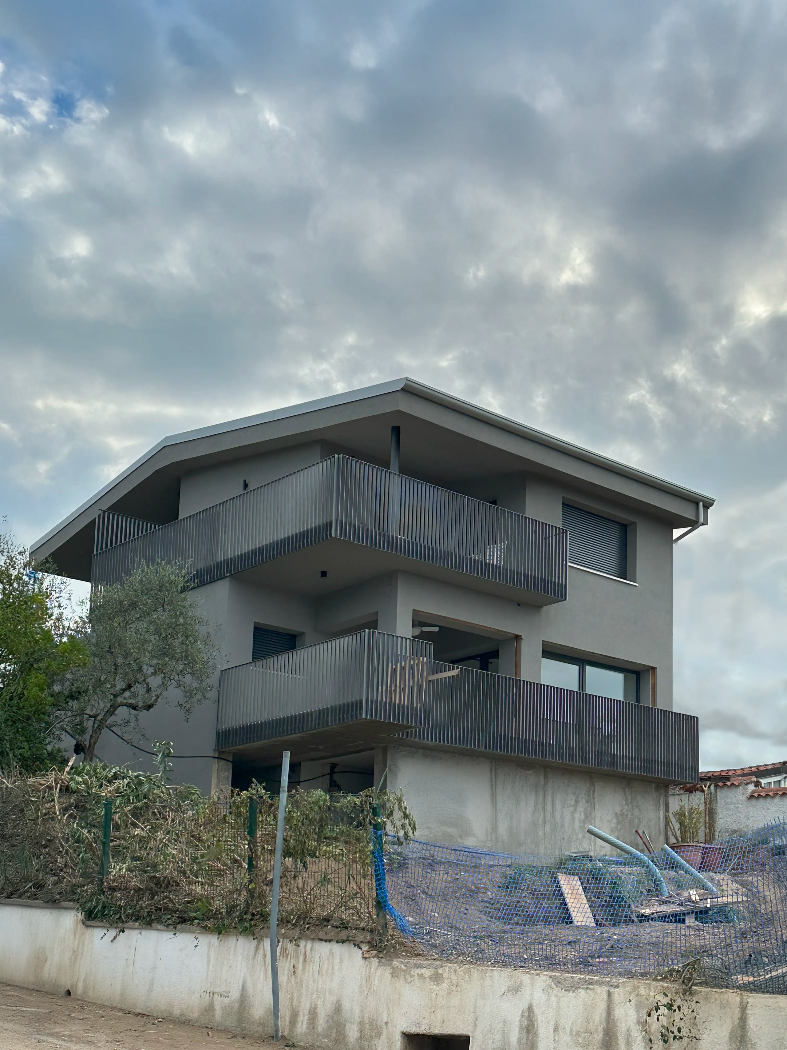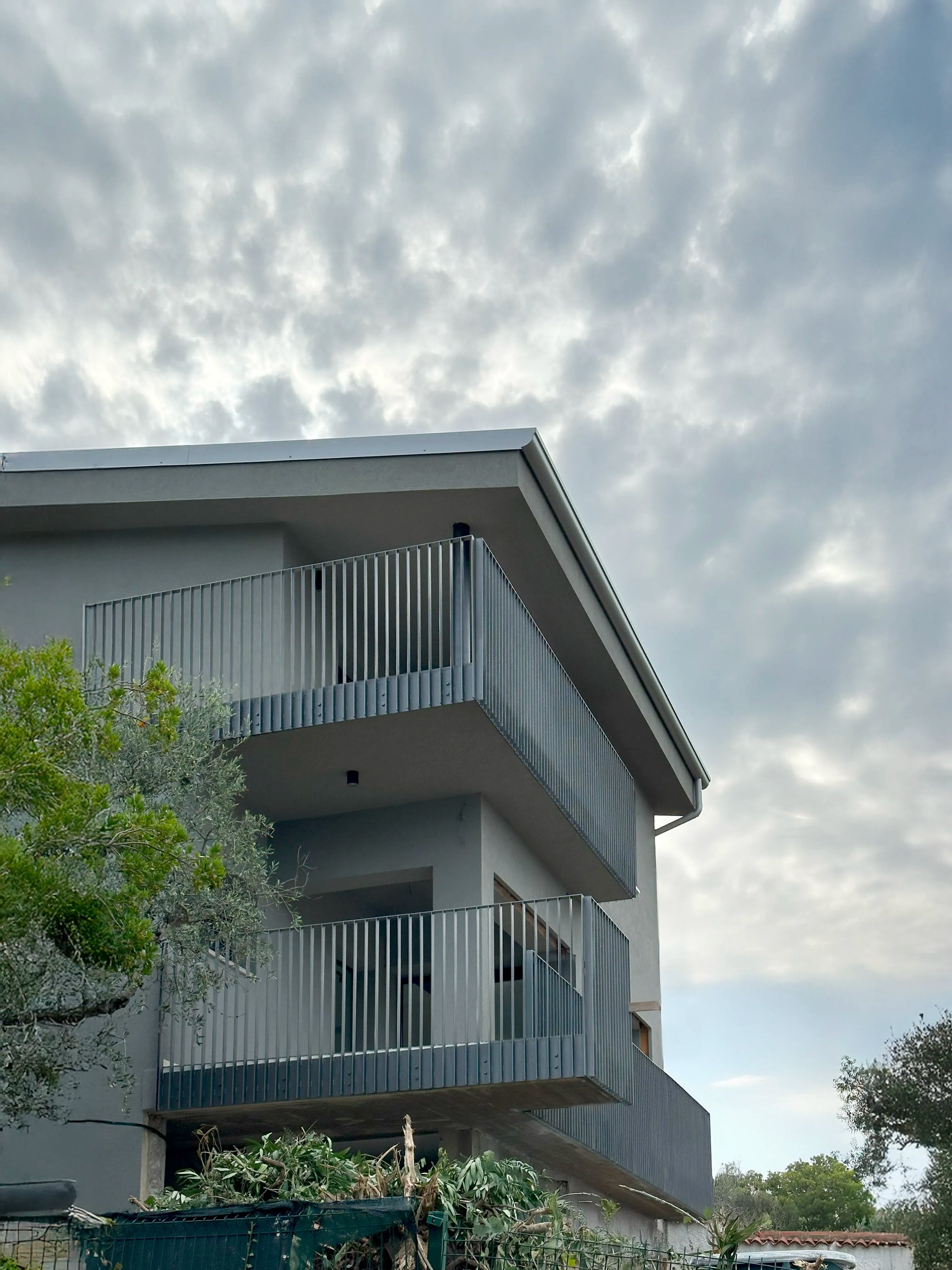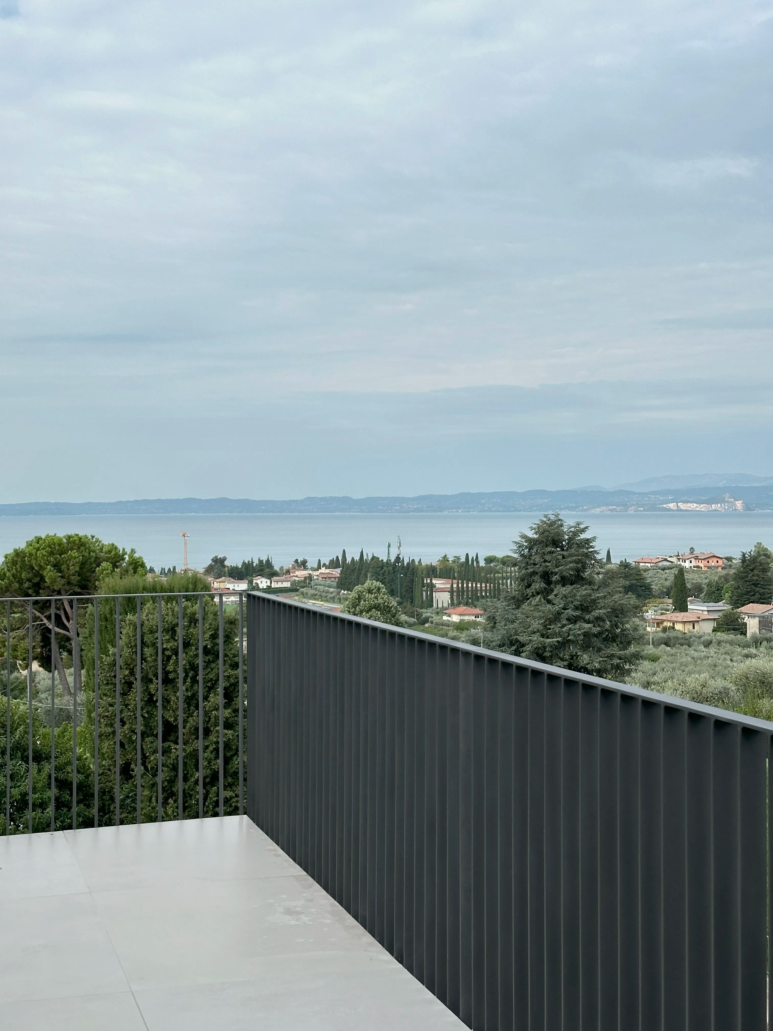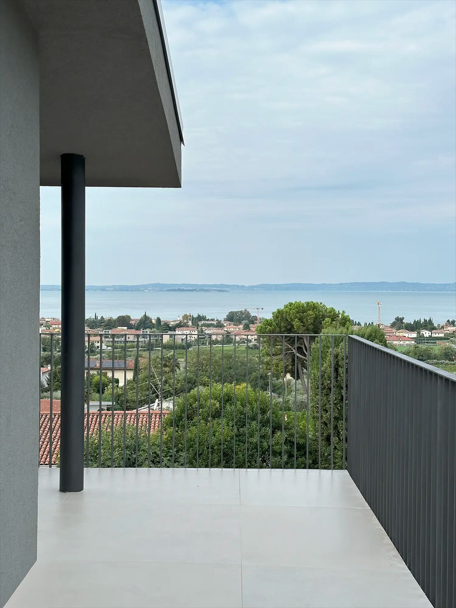I parapetti metallici verticali e la colonna cilindrica scura conferiscono ritmo e leggerezza alle facciate, mentre i rivestimenti in intonaco pigmentato e superfici continue richiamano un’idea di solidità e comfort. L’intervento mira a coniugare il linguaggio dell’architettura razionale con l’atmosfera rilassata del vivere gardesano.