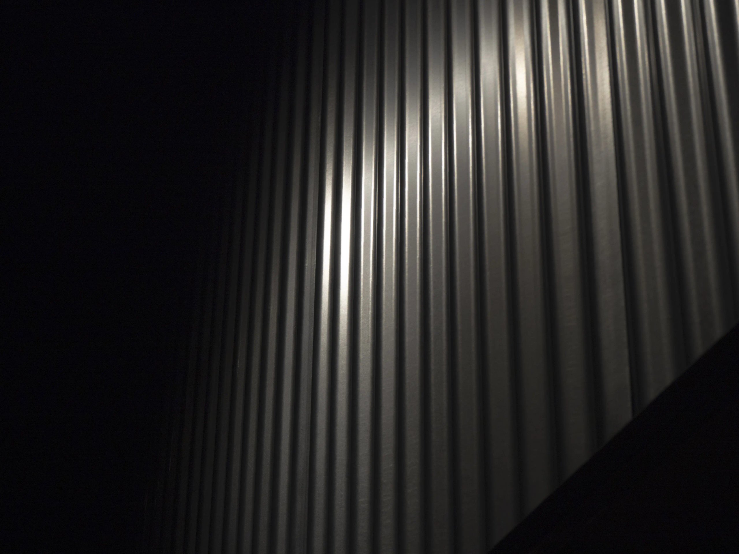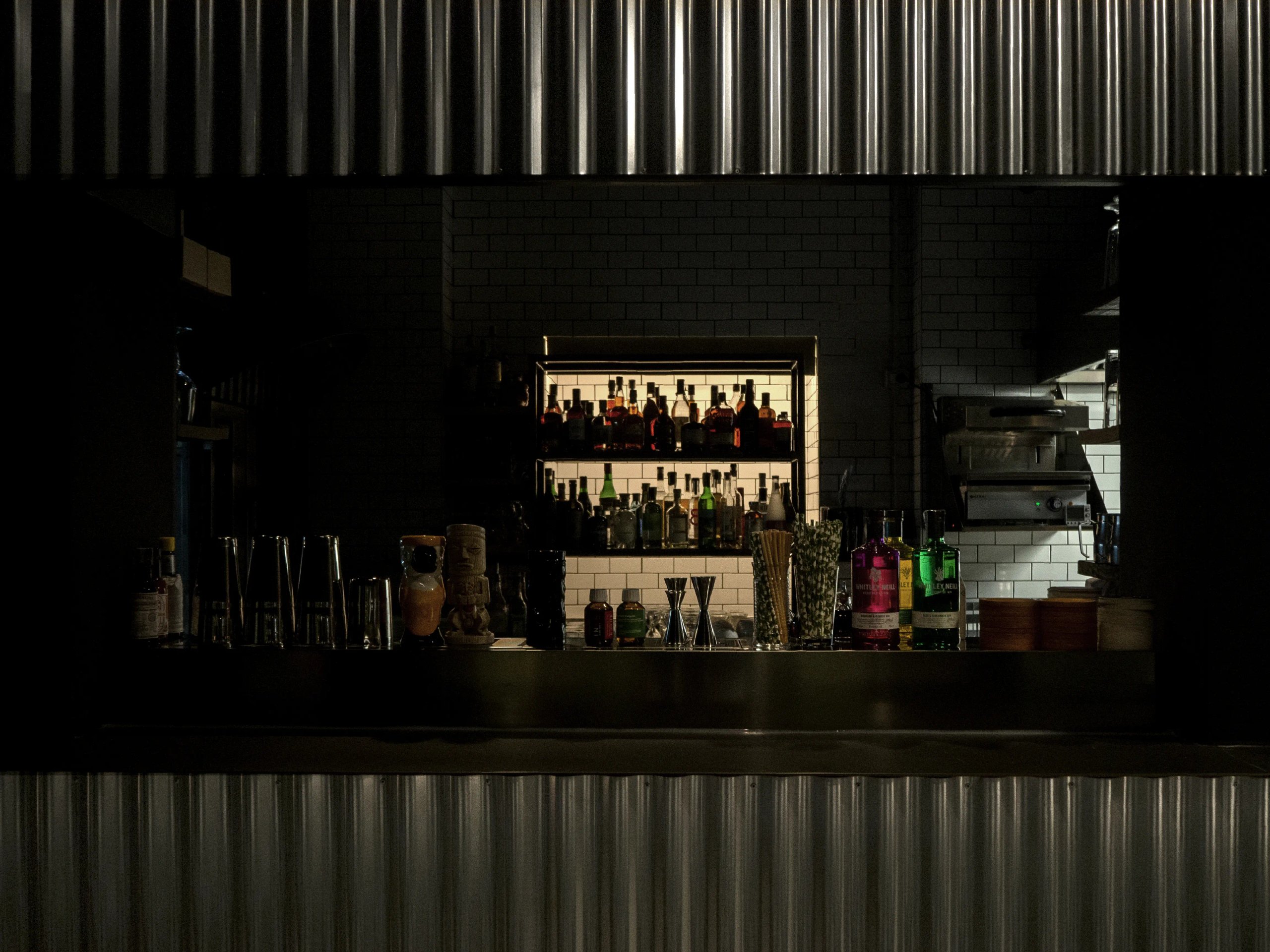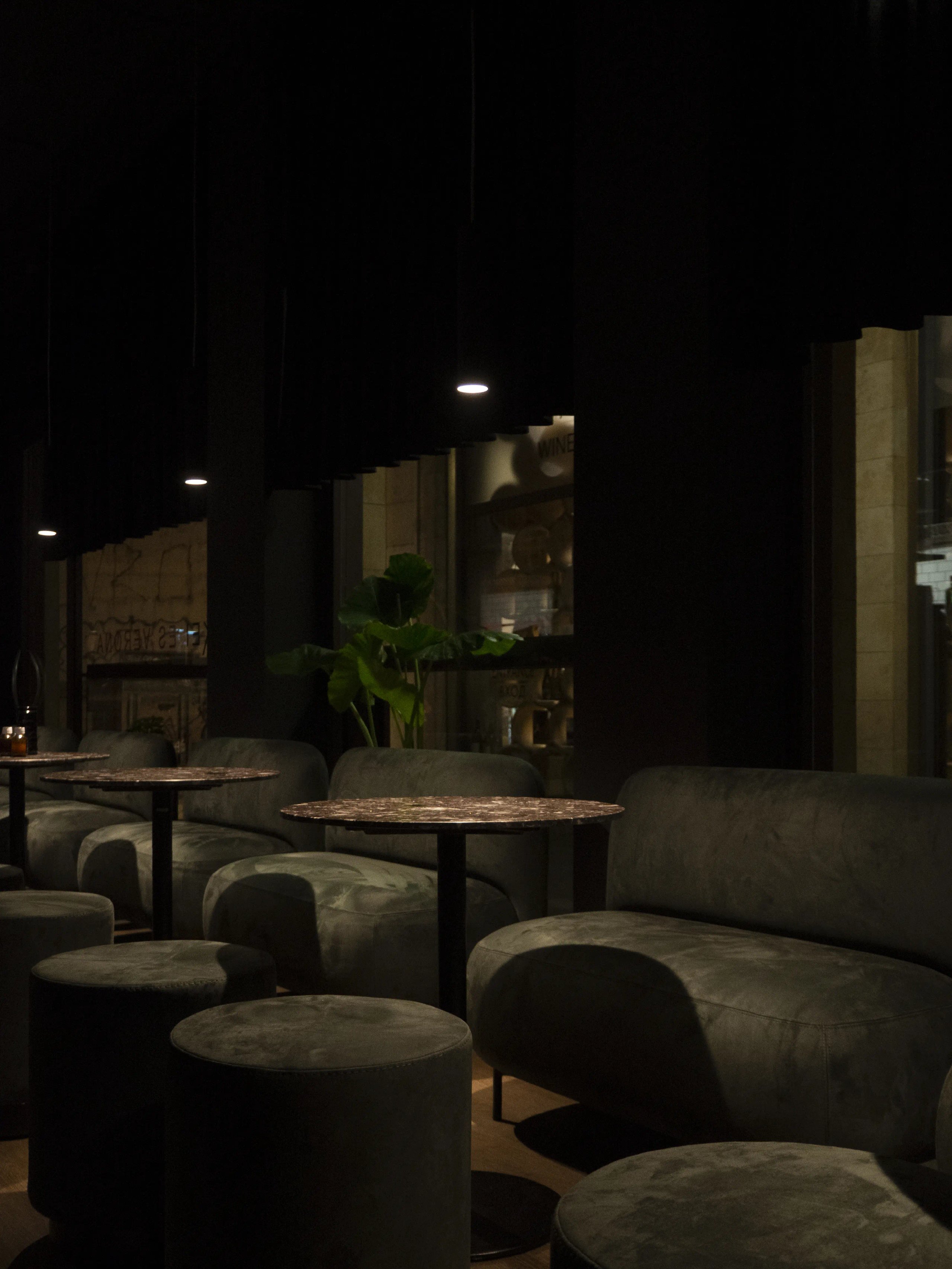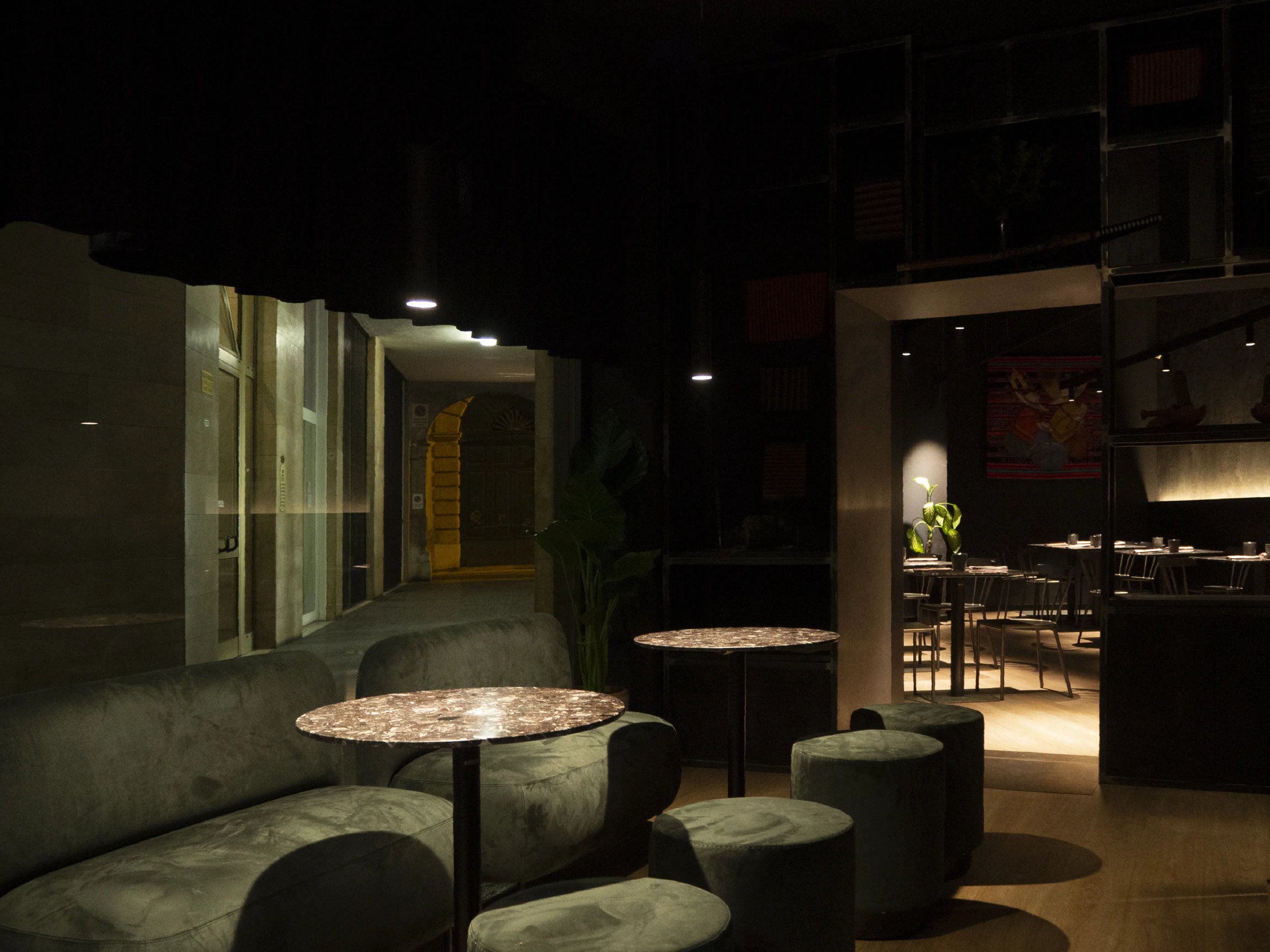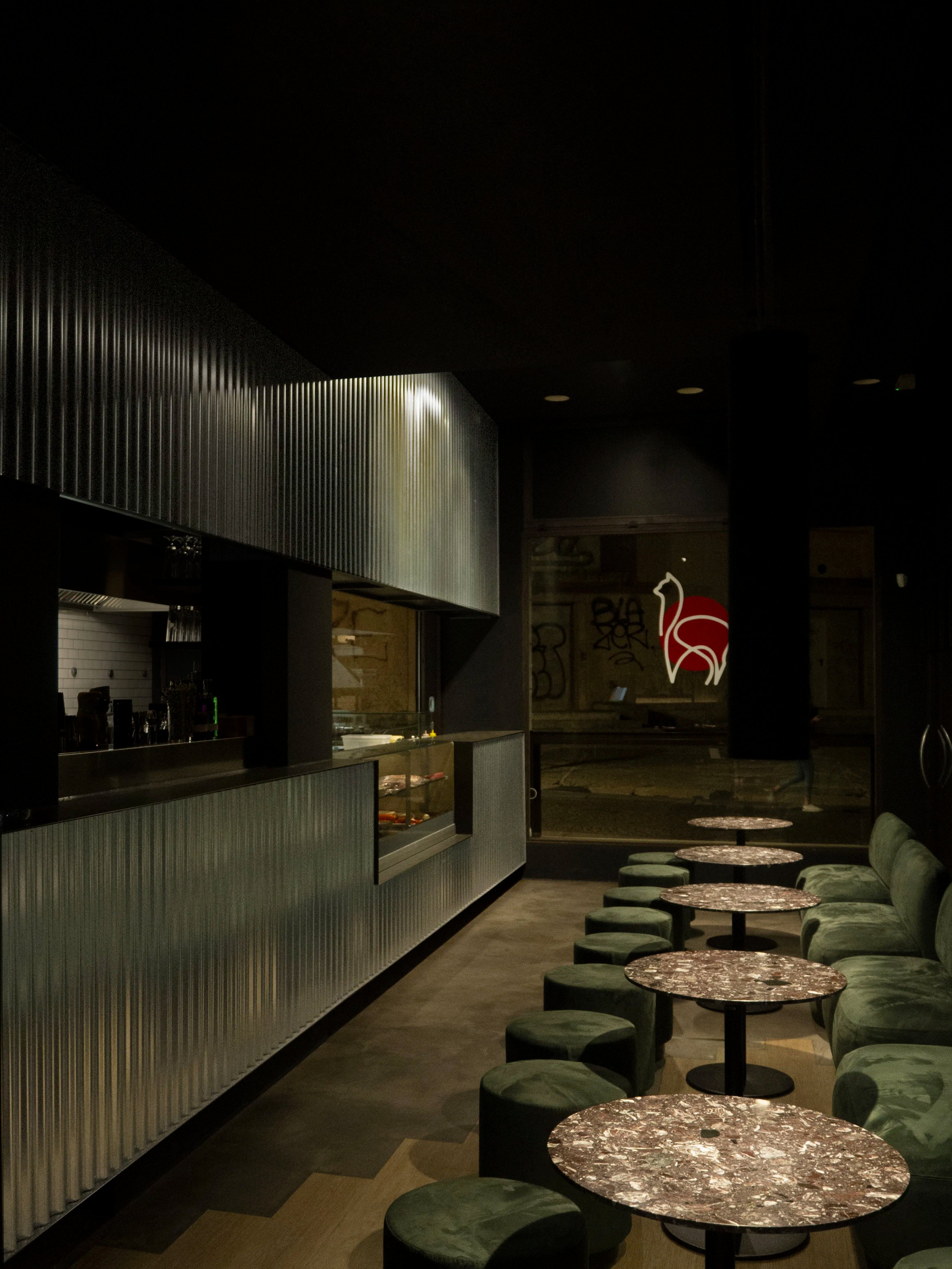 L’uso della pittura nera, luci puntuali e tendaggi in velluto si mescolano ai toni duri del bancone della cucina e drink station a vista in lamiera ondulata zincata.