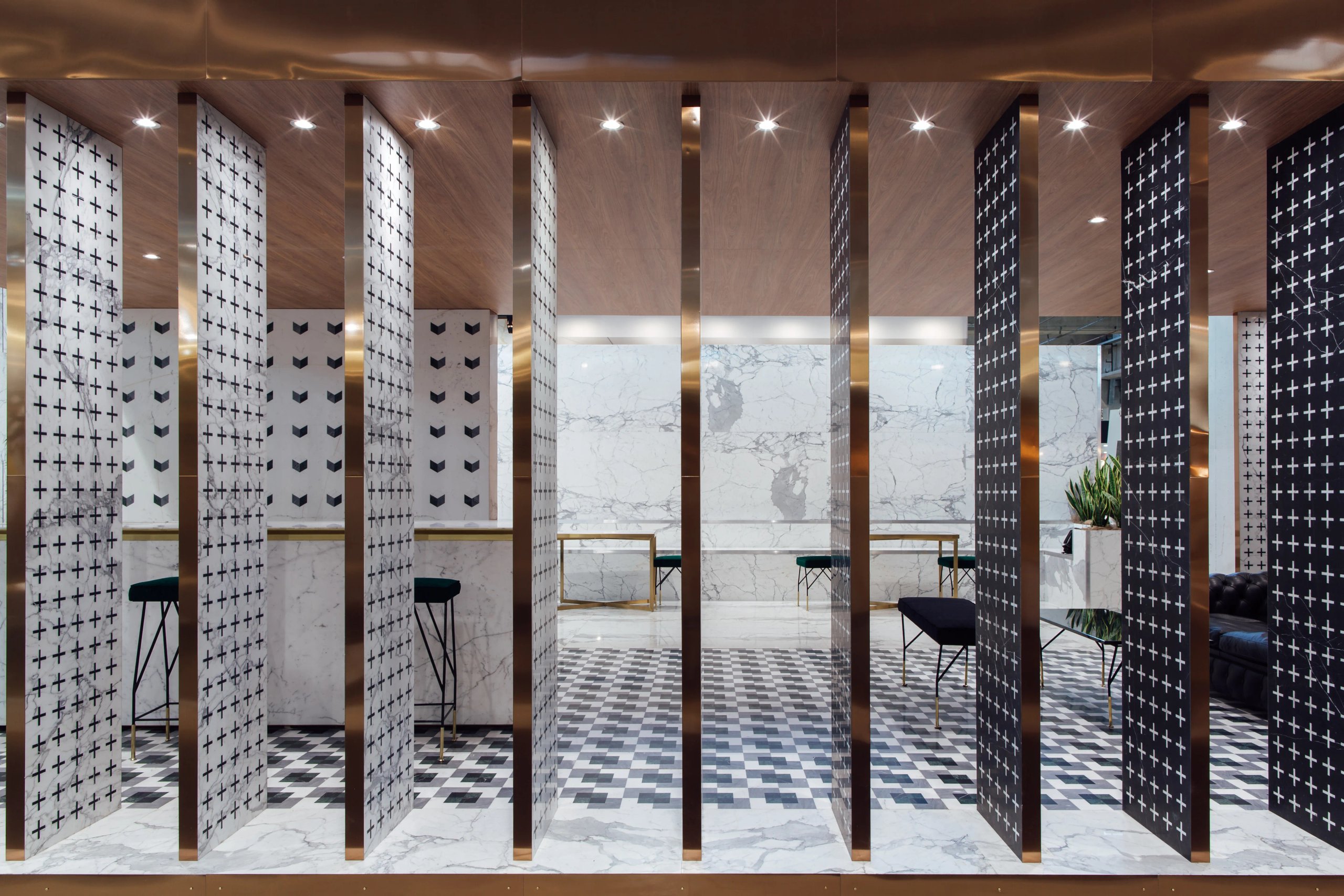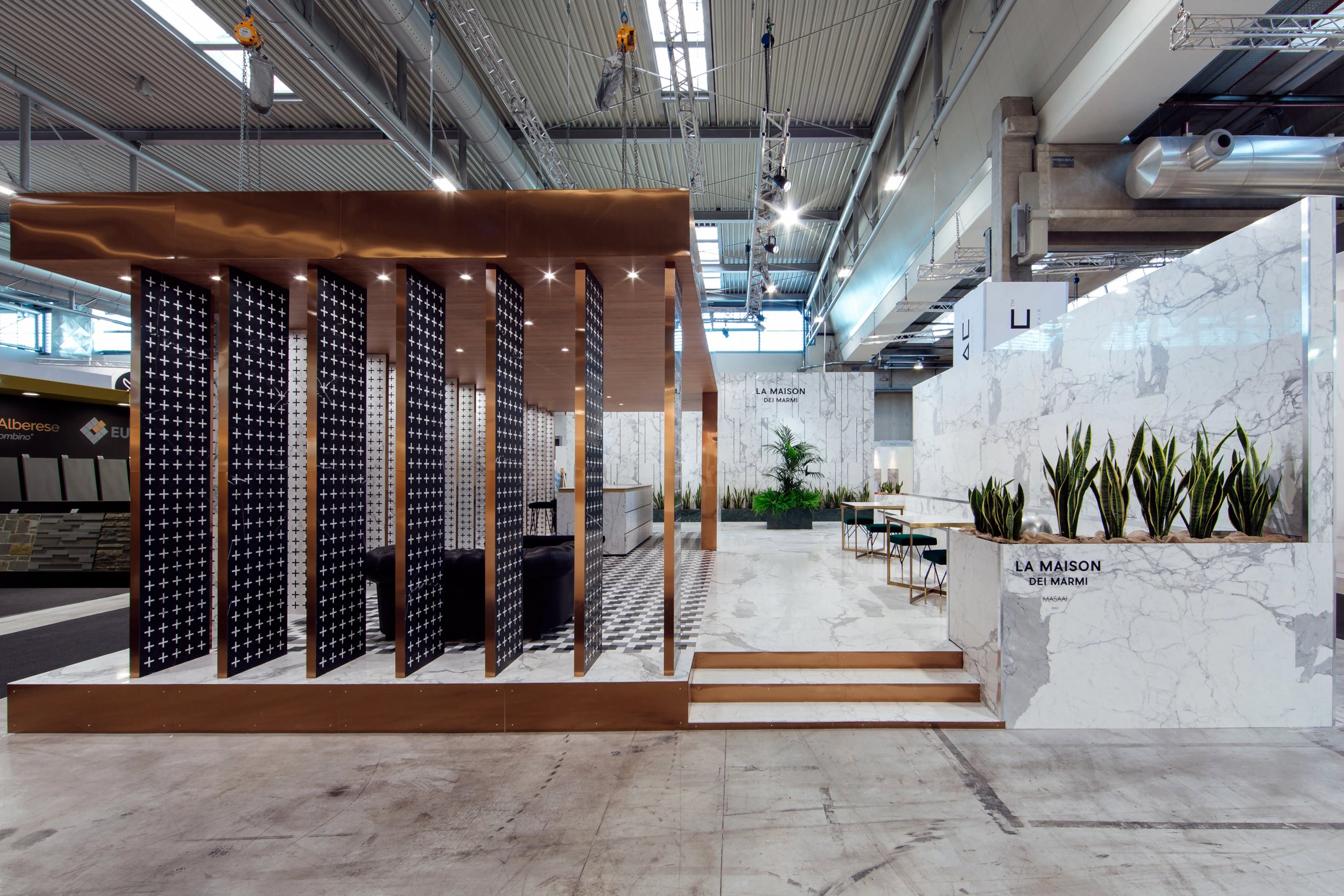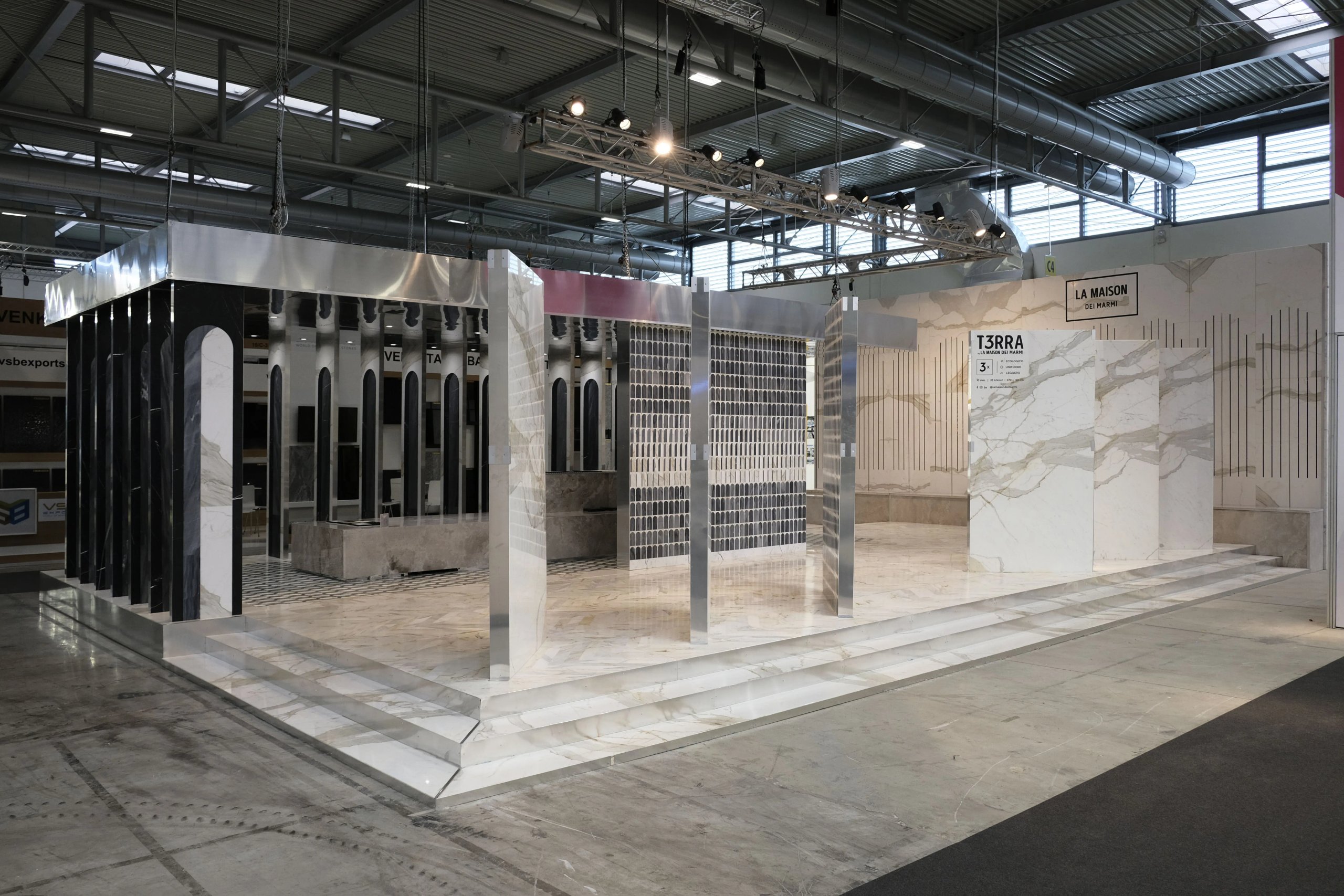 La struttura è stata riutilizzata e riadatta in due edizioni del Marmomacc, cambiando e ripensando di volta in volta i pattern e i motivi geometrici intagliati nelle lastre marmoree, appositamente disegnati dallo studio.