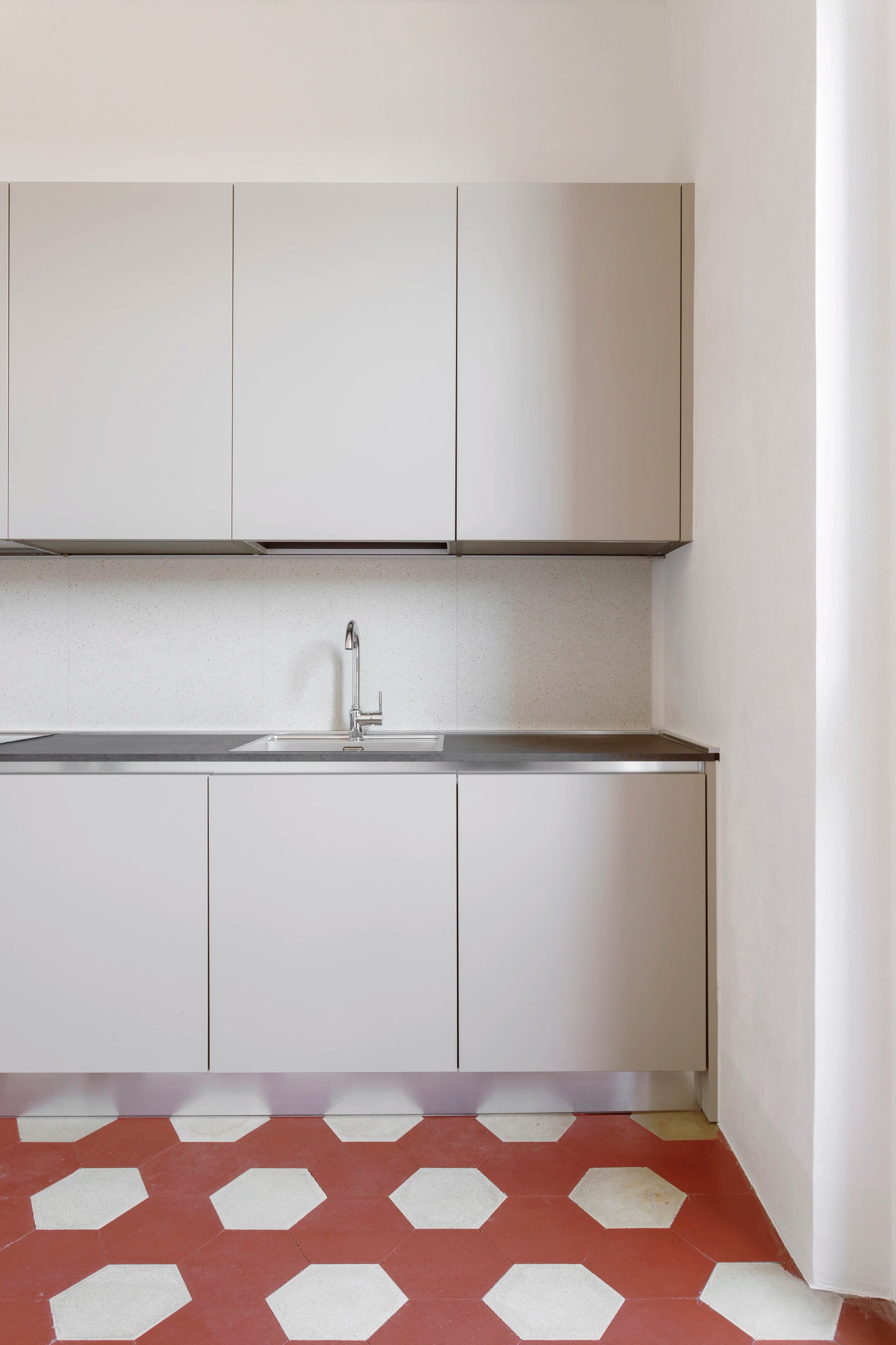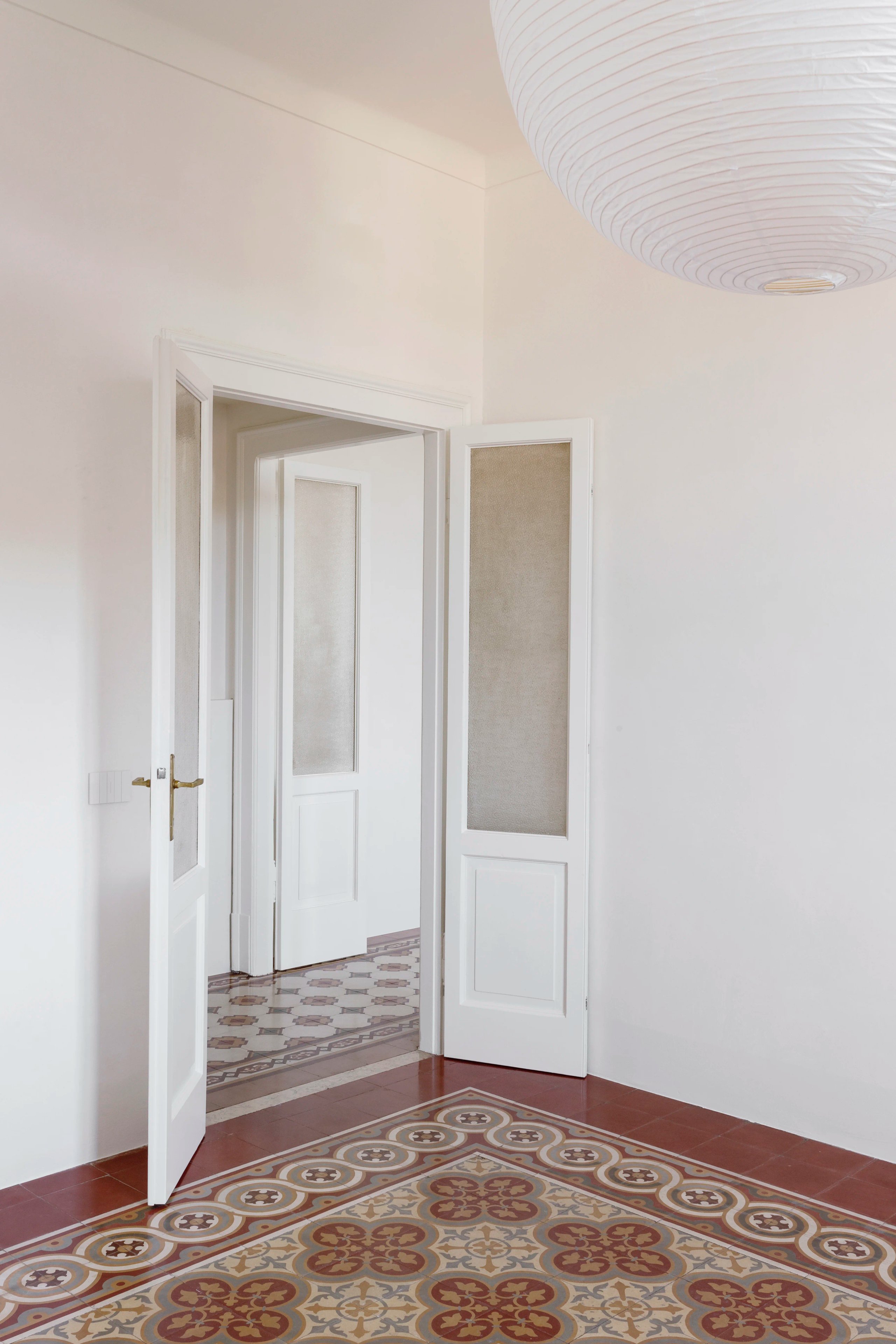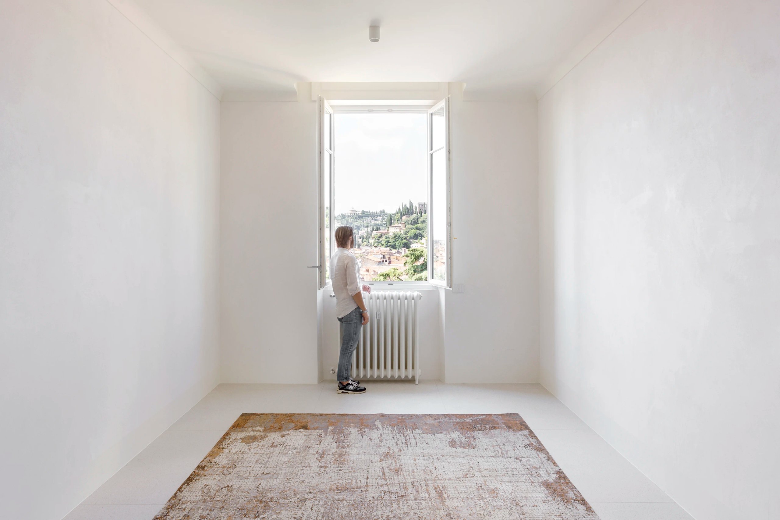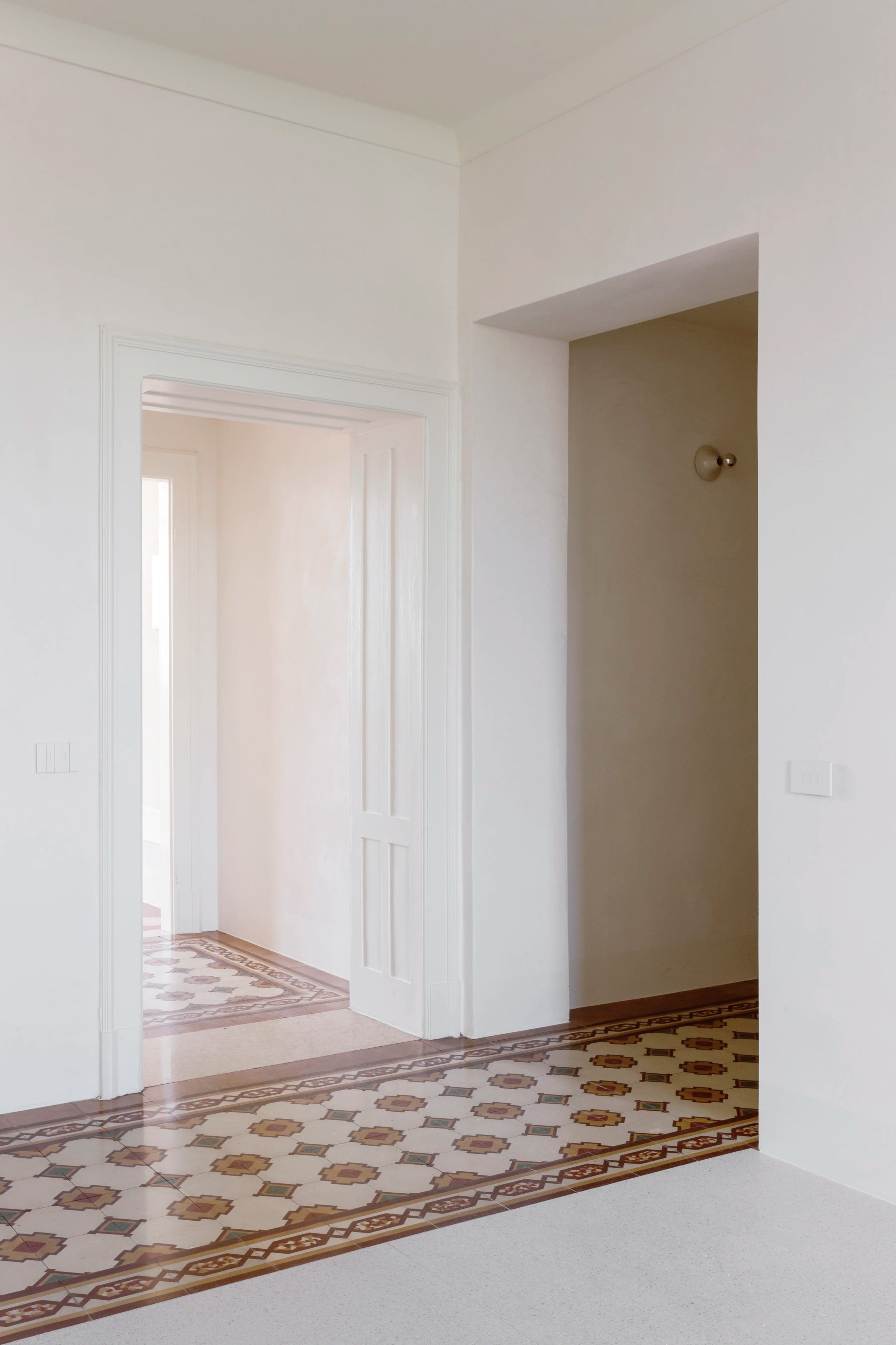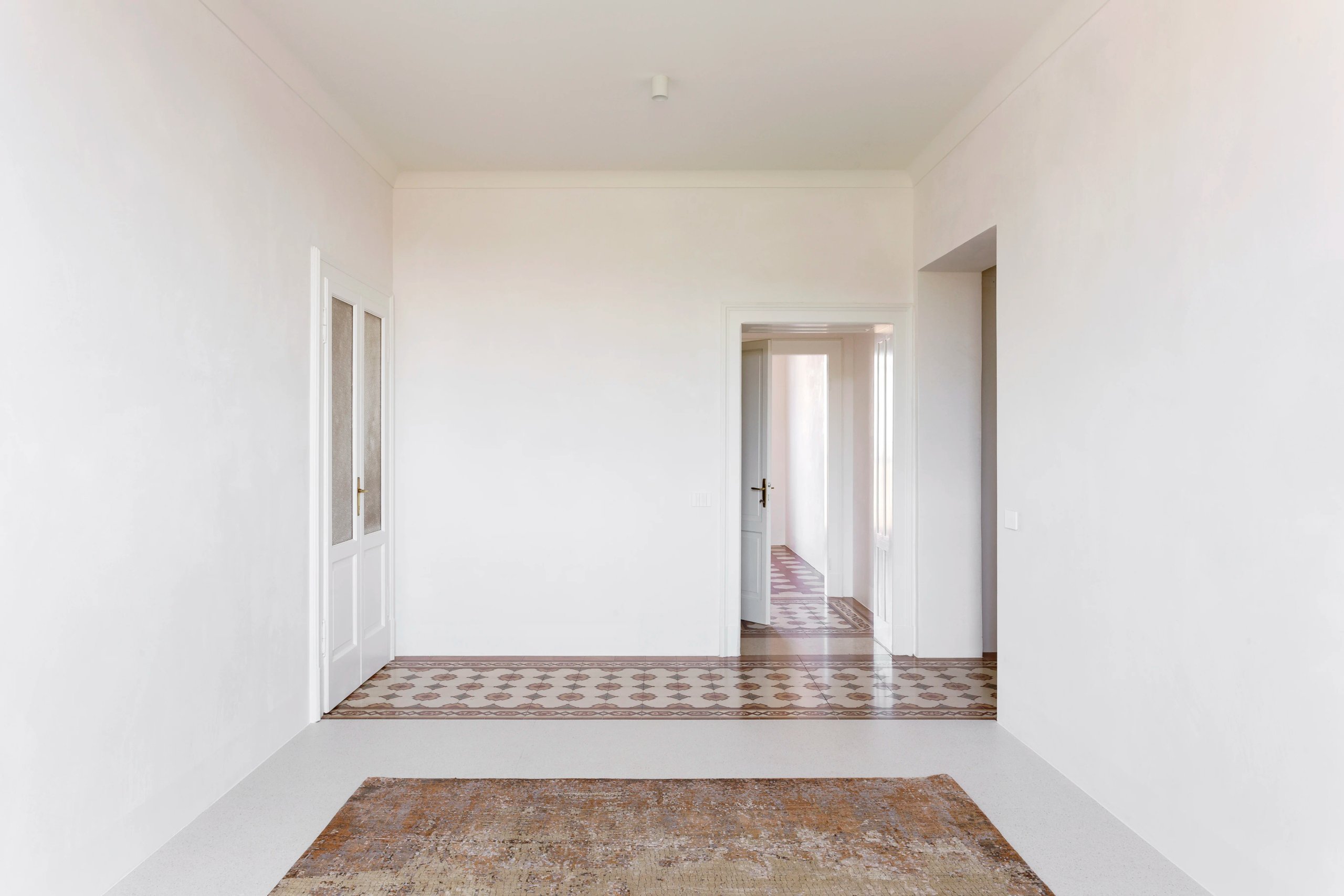 I meravigliosi pavimenti che incorniciano le stanze come tappeti sono riportati alla luce. Marmorino stucco e modanature si confondono tra loro lasciando spazio al bianco candido ed ai colori dei pavimenti per creare un’atmosfera eterea.