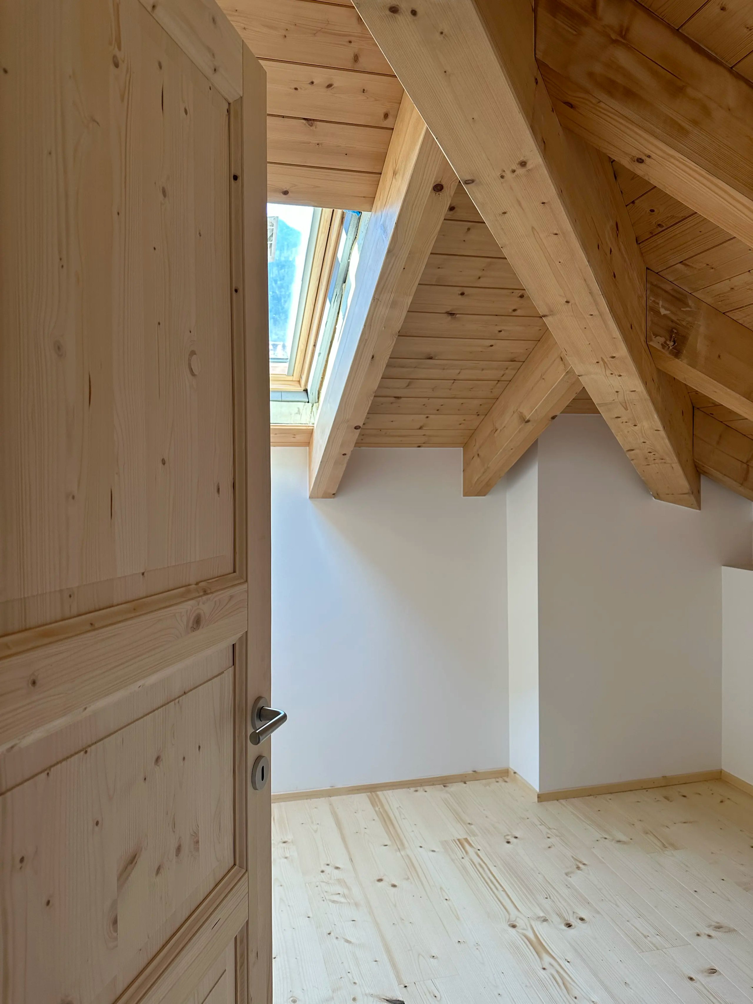 Le unità abitative sono semplici ma curate in ogni singolo dettaglio: intonaci bianchi, serramenti esterni ed interni in legno, arredi su misura progettati in continuità materica con il pavimento in abete naturale. Il doppio affaccio e la realizzazione di nuovi lucernai consentono alla luce naturale di illuminare gli ambienti esaltandone gli aspetti materici e cromatici.