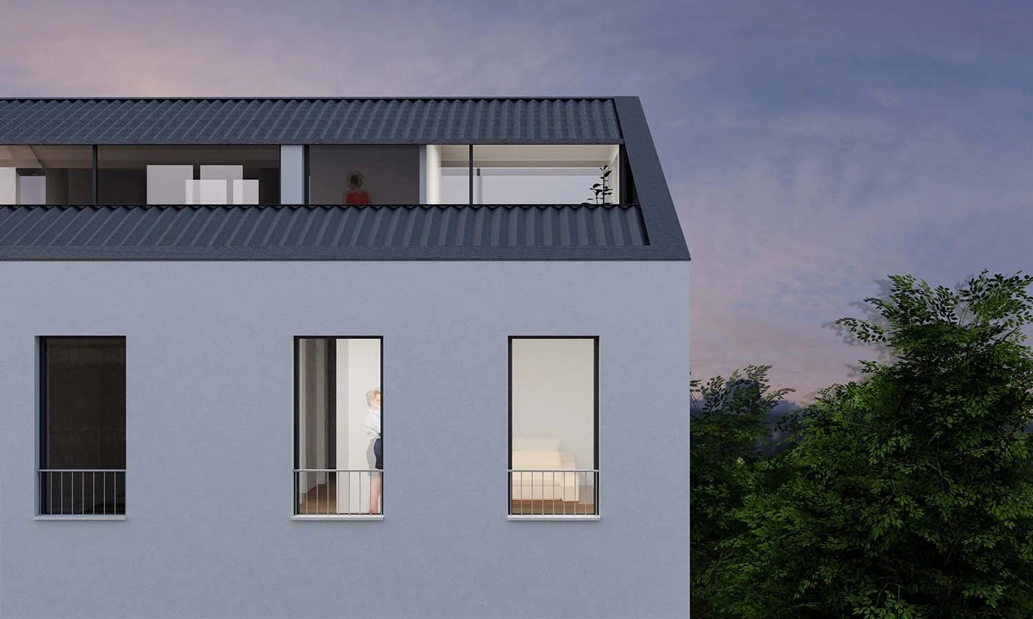 La facciata ha una partitura regolare e continua da cima a terra, nasconde al piano strada i parcheggi e ospita 4 appartamenti con 2 attici con terrazze a tasca sui fronti maggiori.