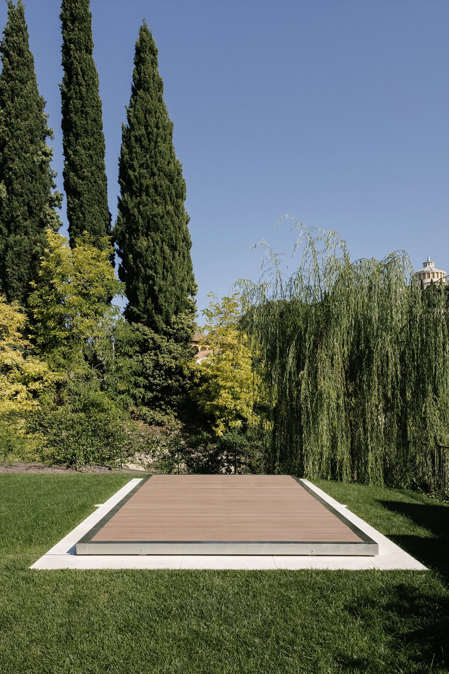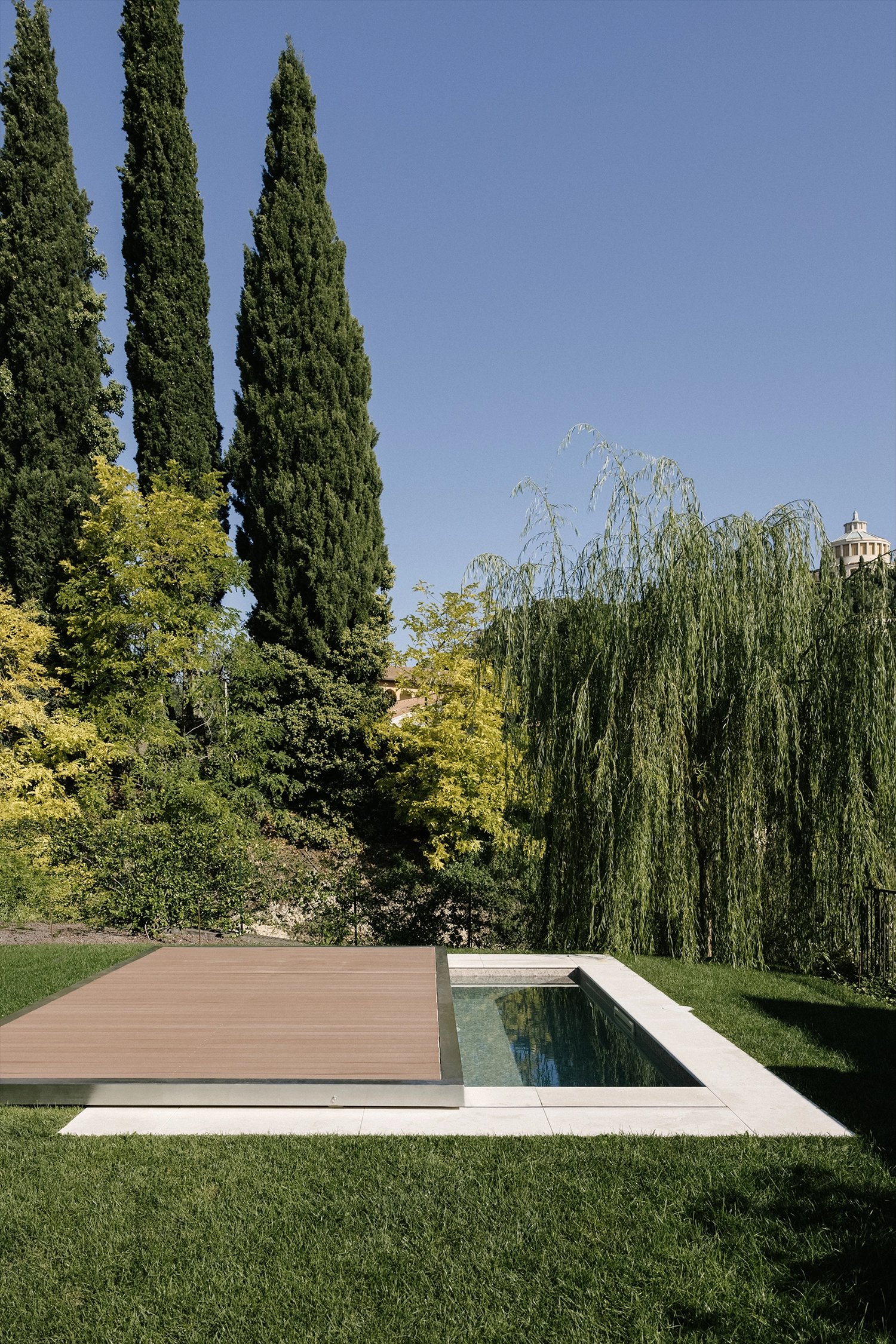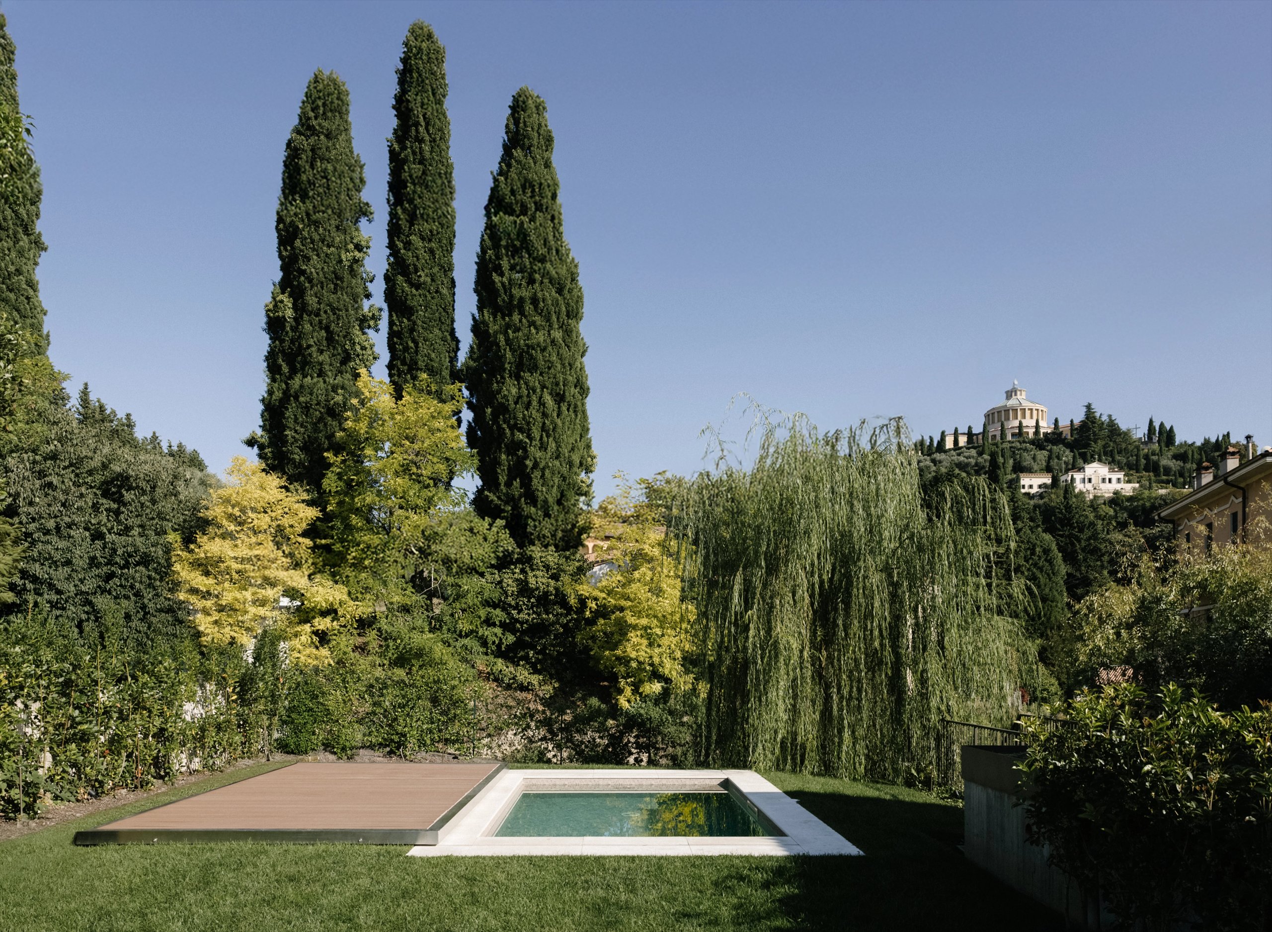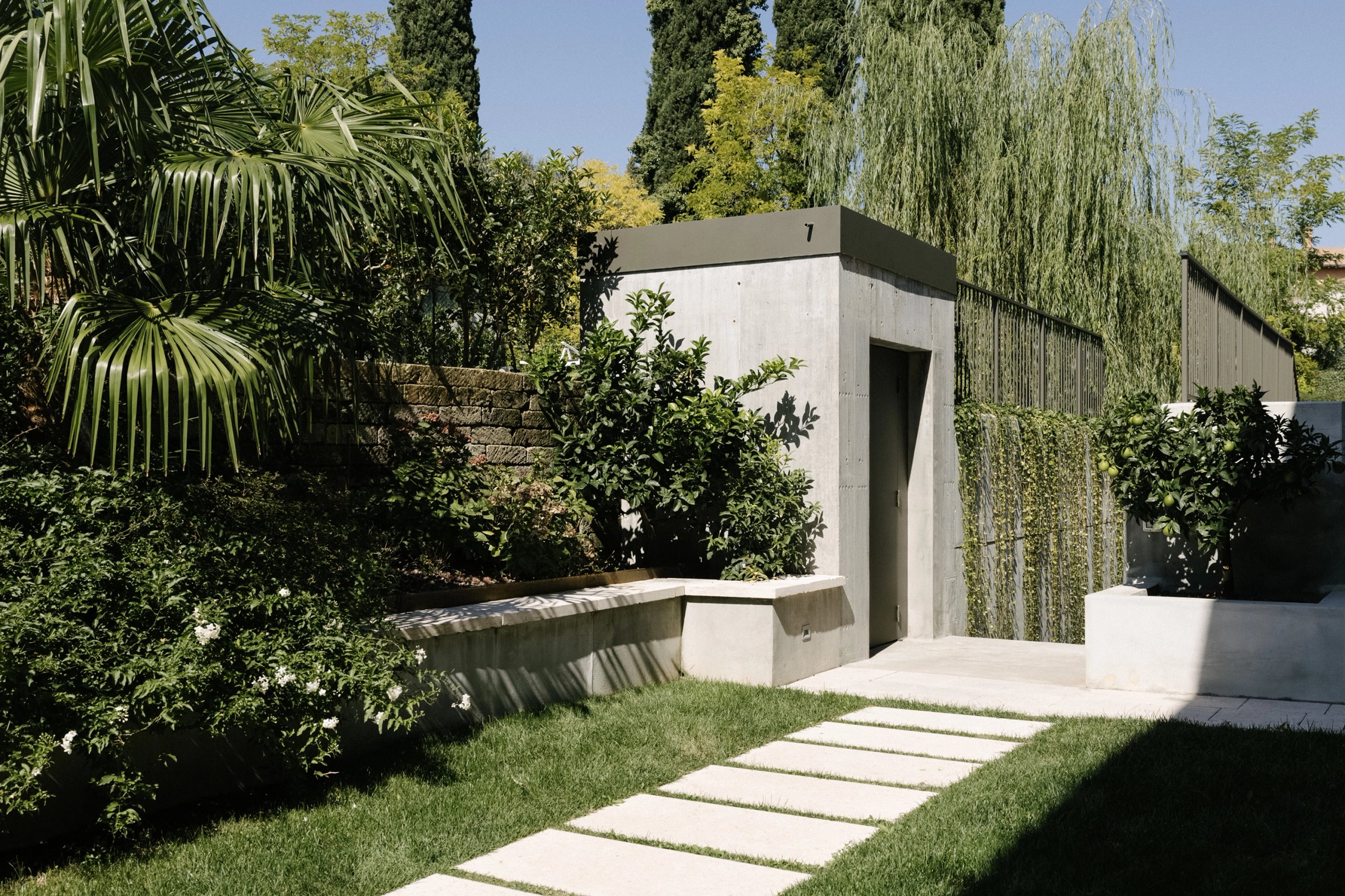 L’intervento si inserisce con discrezione nel giardino, rispettandone l’andamento originario e preservando la relazione tra architettura e paesaggio.