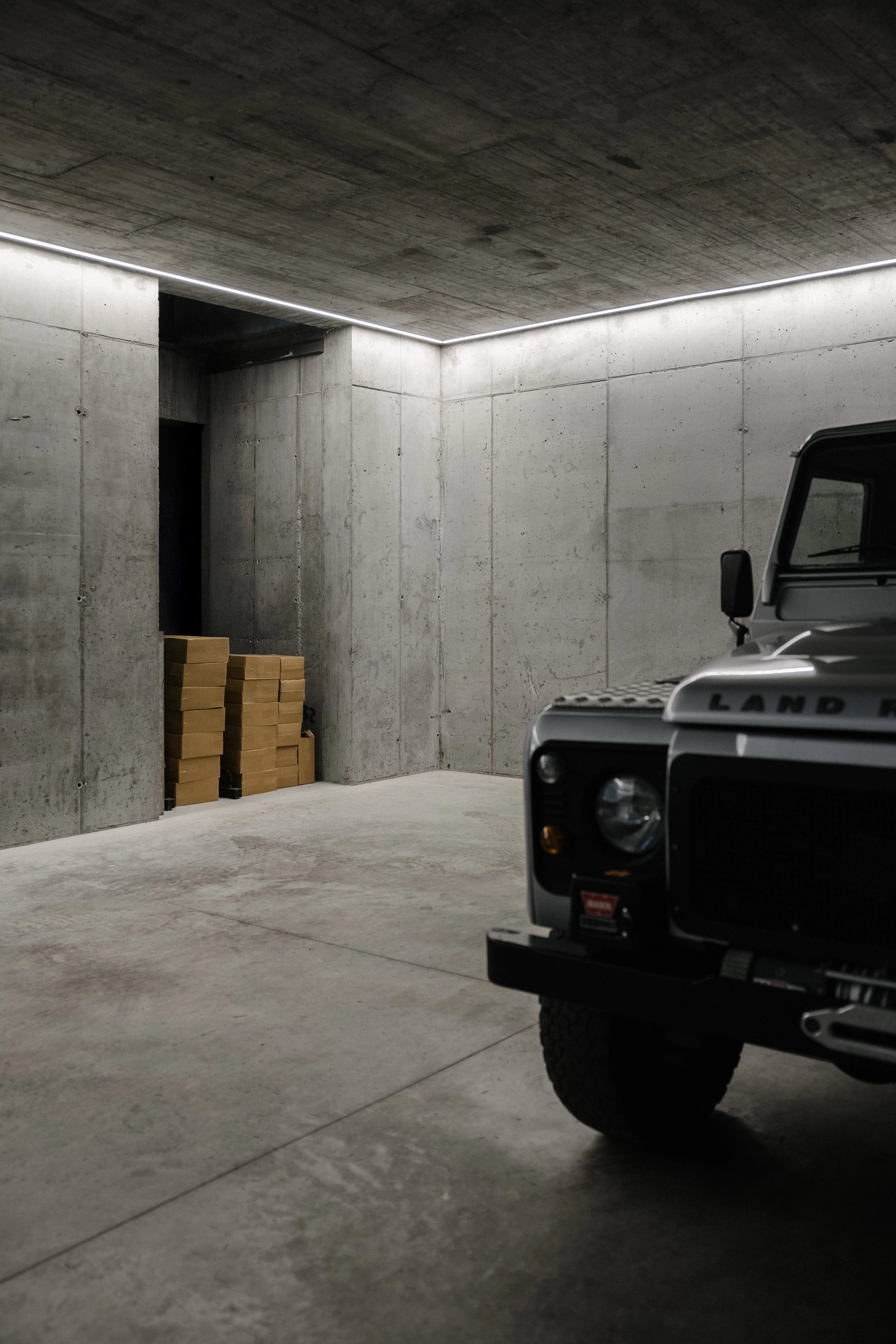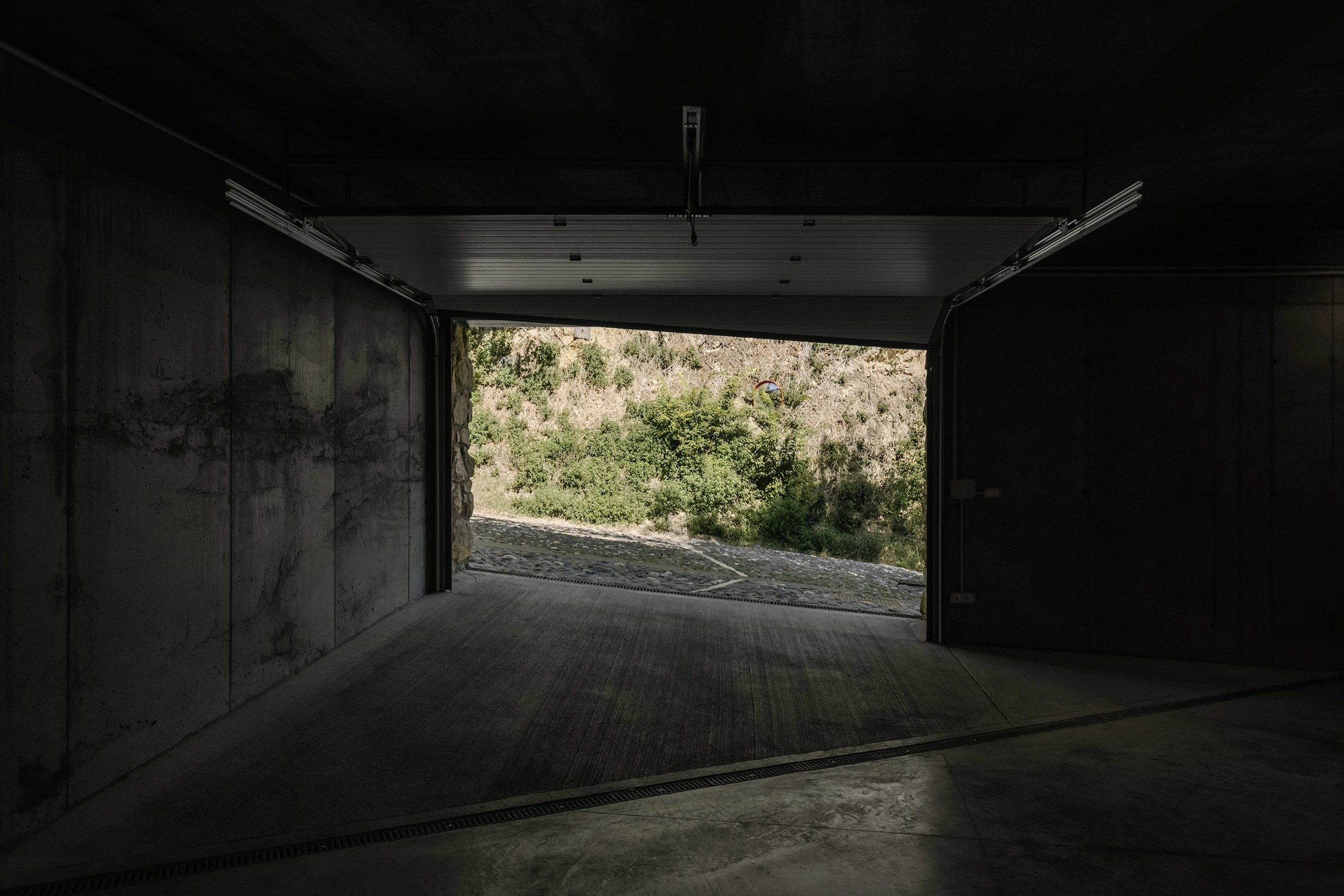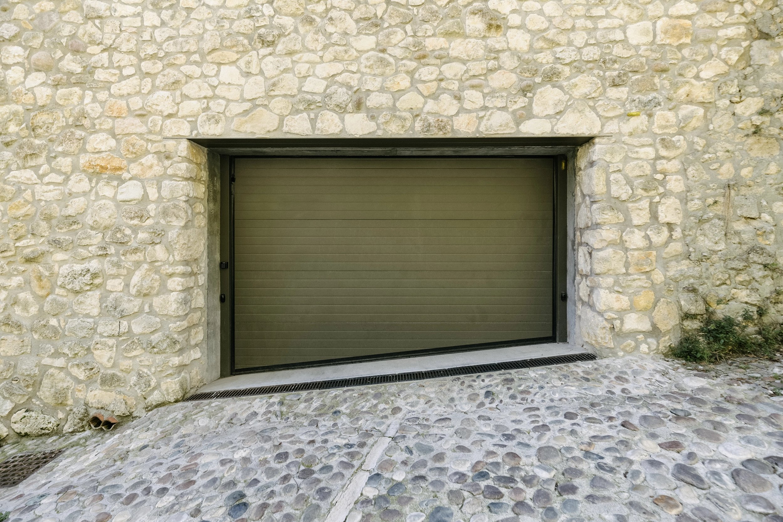 Il fronte e l’ingresso del garage sono stati concepiti in continuità con l’esistente muro di cinta della villa, ricostruito in sasso per integrarsi in modo naturale nel contesto.